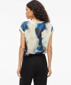 VILA ELLETTE BEIGE SATIN TOP IN NAVY/GREEN PRINT