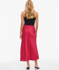 VILA ELLETTE HIGH WAIST SATIN MIDI SKIRT IN JAZZY RED