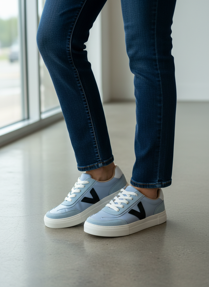 • Color: Features a white upper accented with blue faux suede detailing.