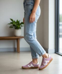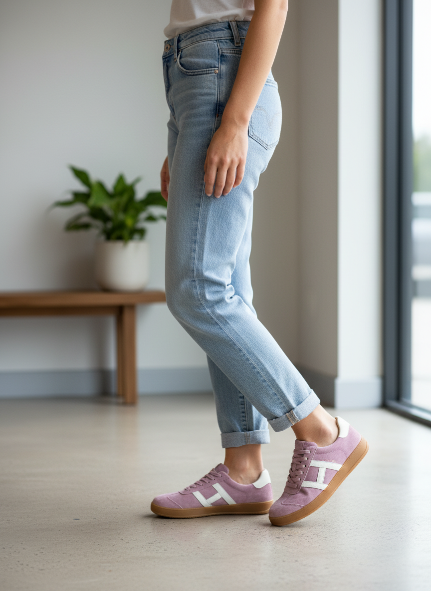 Stylish and comfortable trainer, known for its suede-effect upper, synthetic leather overlays, and lace-up fastening. The shoe features a flat sole, adding trendiness to the look. Reviews mention its blend of fashion and function, making it a popular choice for those seeking a fusion of style and Slim Sole Lace Up Trainer with Top Tone Contrast Colouring .