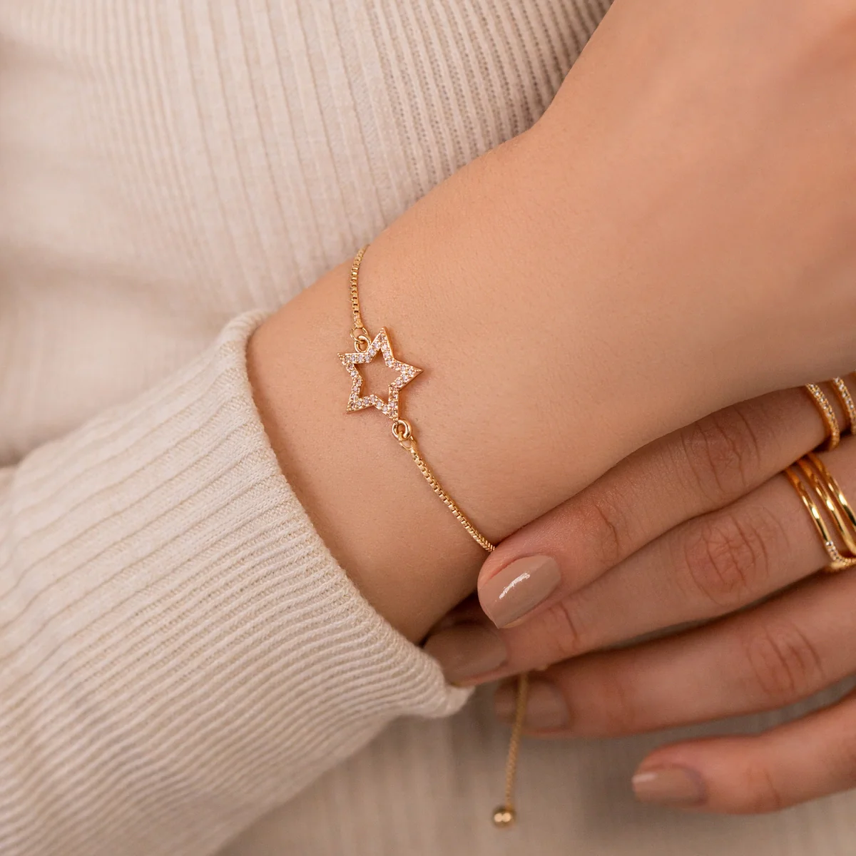 Eclectic yet contemporary, chic yet classic, understated yet eye-catching: star pendant bracelets are a fashion trend that will never fade. Paved with glittering cubic zirconia, crafted from high-quality gold plate, this stunning drawstring piece is a spectacular addition to your jewellery box.