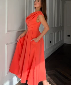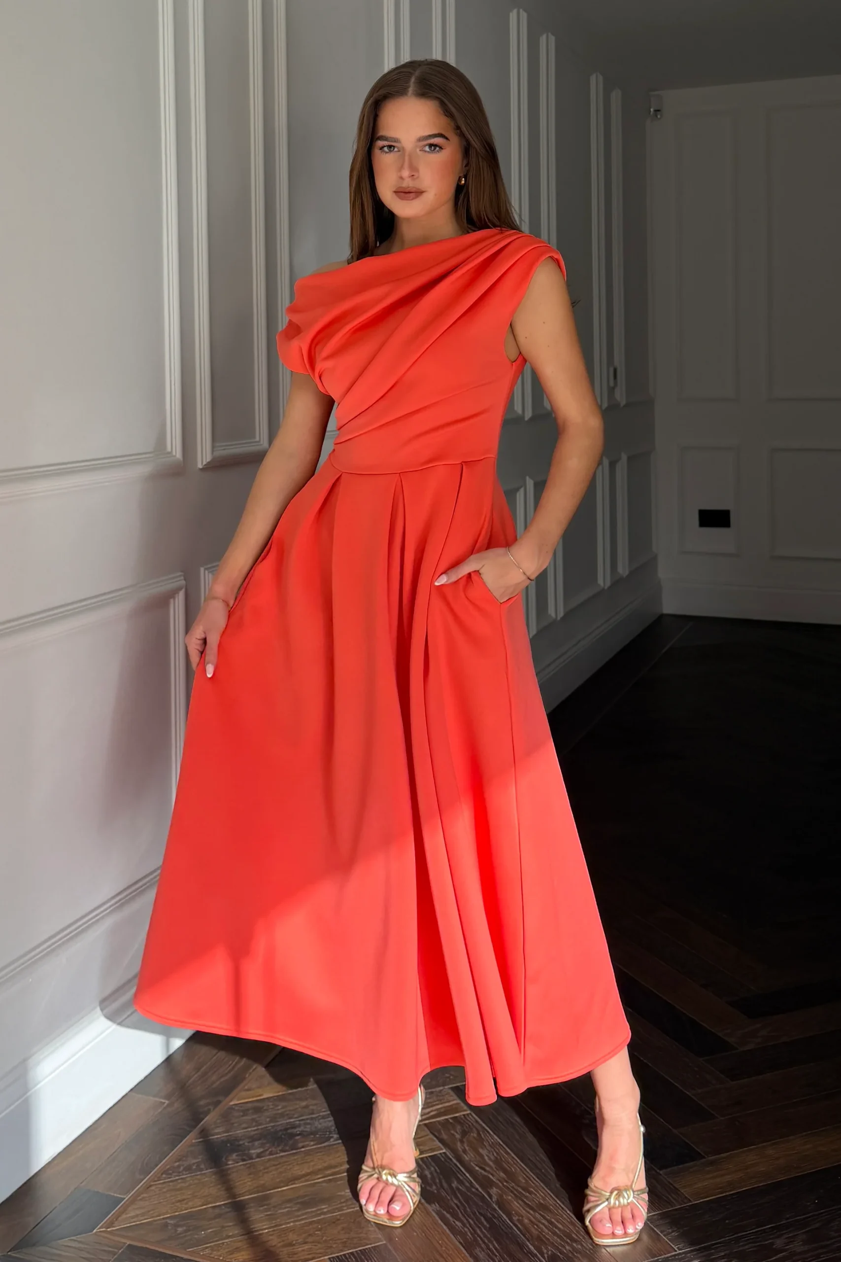 GIRL IN MIND BETTY ASYMETRIC MIDI DRESS IN CORAL