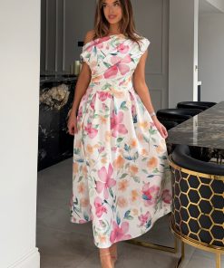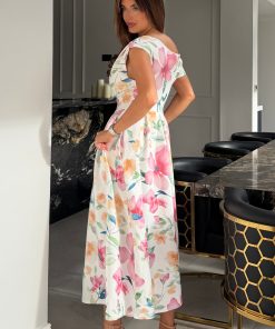 GIRL IN MIND BETTY ASSYMETRIC NECKLINE MIDI DRESS IN WHITE WITH FLORAL PRINT