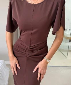 GIRL IN MIND CLEO RUCHED DETAIL MIDI DRESS IN BROWN COLOUR