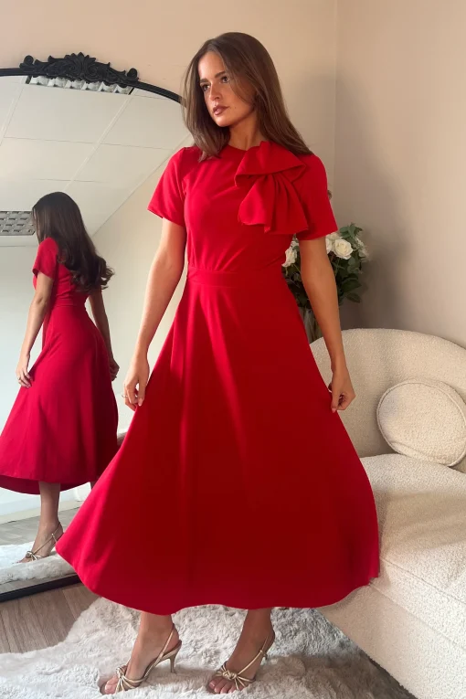 Give your look a statement twist with our stunning Minta Bow Detail Midi Dress. Featuring statement bow, floaty skirt and elegant short sleeve. This dress will make a statement at any occasion.
