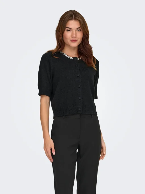 Top off your look with a timeless, feminine knit and add softness and warmth. Flat knit is a type of knitting characterised by its flexibility, comfort, and clean look. JDY is a full-concept, international fashion brand offering affordable and on-trend products to the fashion-conscious consumer. – Product Type : Knitted cardigan – Neck : Round Neck – Sleeve : 2/4 sleeves – Sleeves : Puff sleeves – Cuffs : Ribbed cuffs – Closing : Button fastening – Length/Size : Short – Extra details : Rhinestones – Fit : Knit Fit Cardigan
