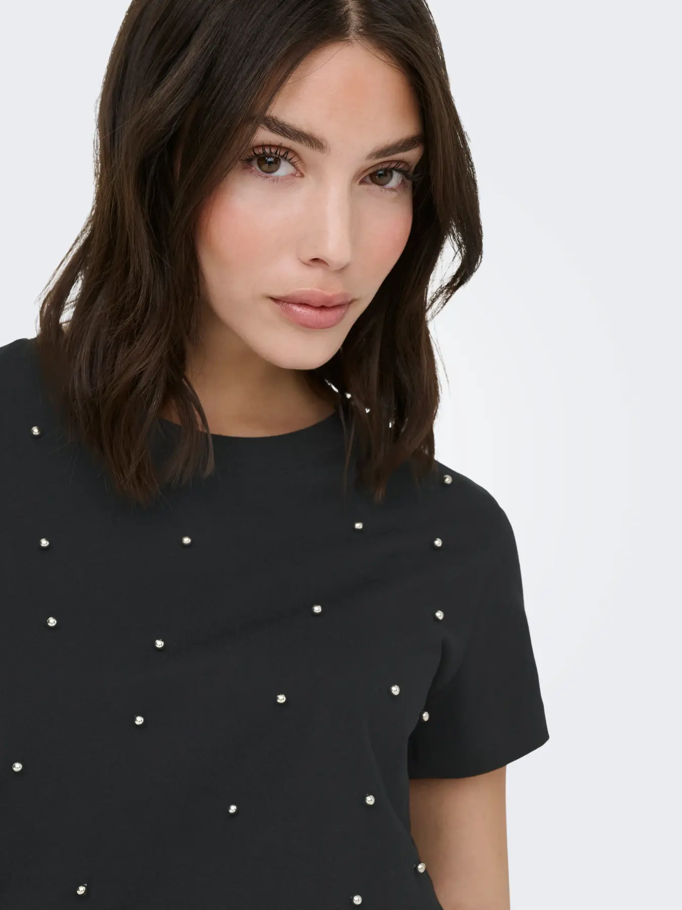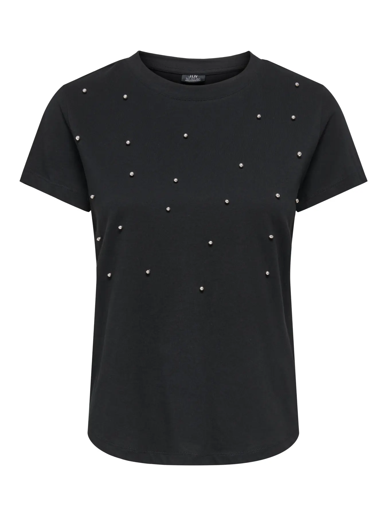 Change your everyday outfit in a second by adding a feminine top for a soft, clean expression. Jersey is a soft, stretchy material designed for maximum comfort. JDY is a full-concept, international fashion brand offering affordable and on-trend products to the fashion-conscious consumer. – Product Type : T-shirt – Neck : Round Neck – Sleeve : Short sleeves – Extra details : Studs – Fit : Standard Fit