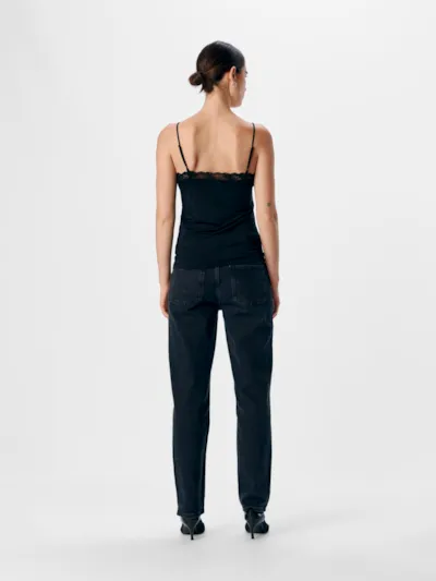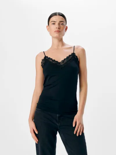 Your everyday saviour, this lace singlet top can be worn with anything and everything. When it comes to rules – there are none. Jersey is a lightweight knitted fabric with stretch, which is synonymous with comfort and movement. – Product Type : Tank top – Neck : V-Neck – Sleeve : Sleeveless – Straps : Adjustable straps – Extra details : Lace detail – Fit : Stretch Fit