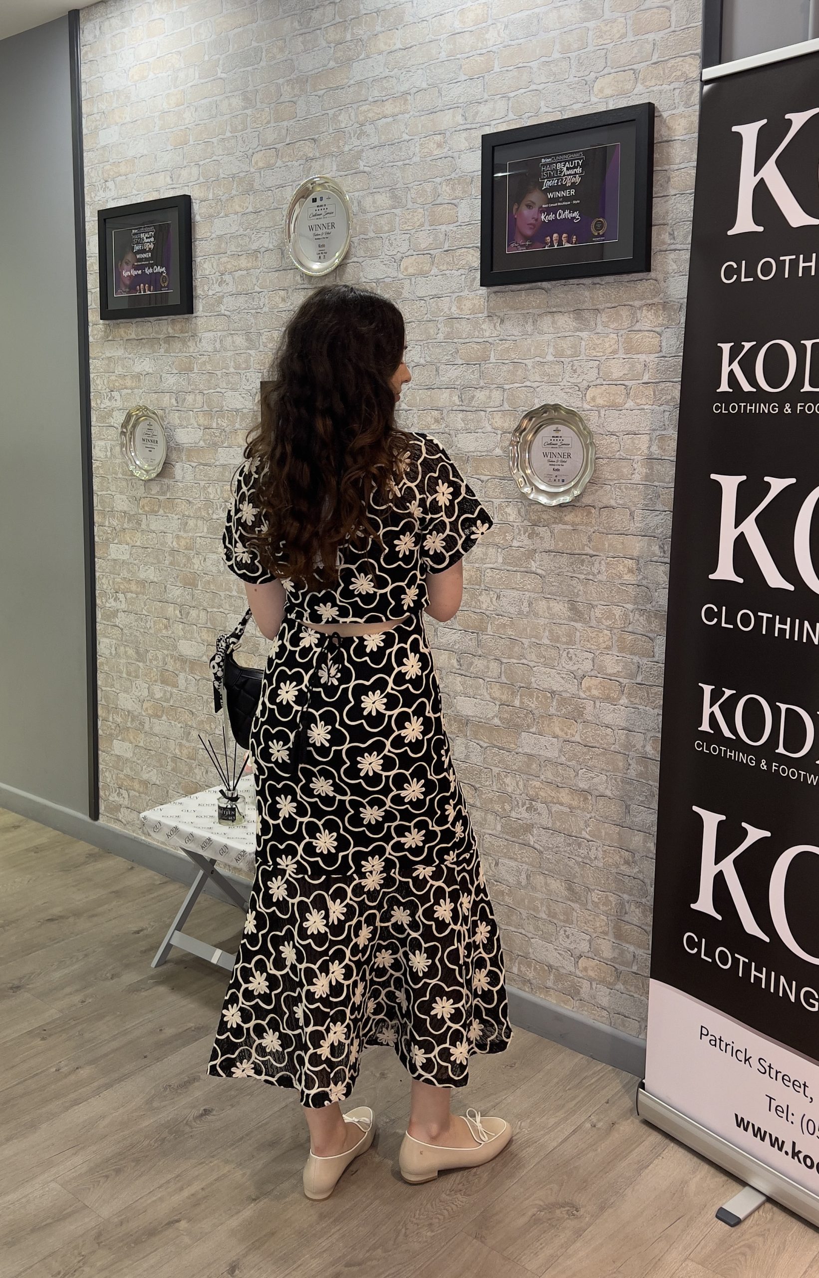 Add a touch of elegance with our Object Calla flower MIDI dress. Featuring a delicate flower embroidered design and lined crochet fabric, this dress is perfect for any occasion. The open panel on the back and tassel detail add a playful and alluring touch. Perfect for a night out or a special event!