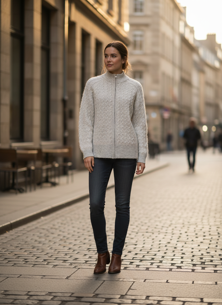 Throw it on with a pair of jeans for everyday ease or use it to dress down a glitzy skirt. Whatever your way, the knitted pullover is undoubtedly your year-round closet hero. Knit is created by intermeshing loops of yarn for stretchy, warm and cosy garments. – Product Type : Knitted cardigan – Neck : High neck – Sleeve : Long sleeves – Sleeves : Balloon sleeves – Cuffs : Ribbed cuffs – Closing : Zip fastening – Fit : Loose Fit