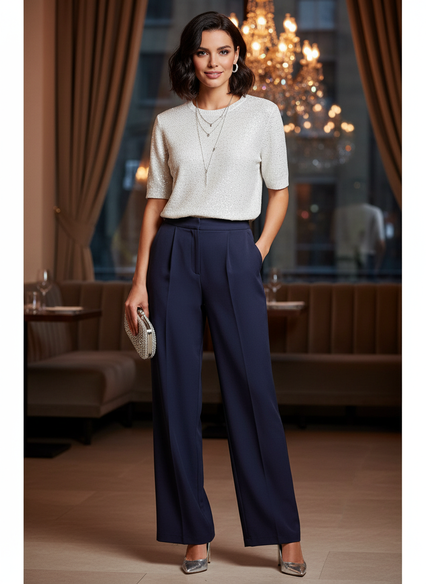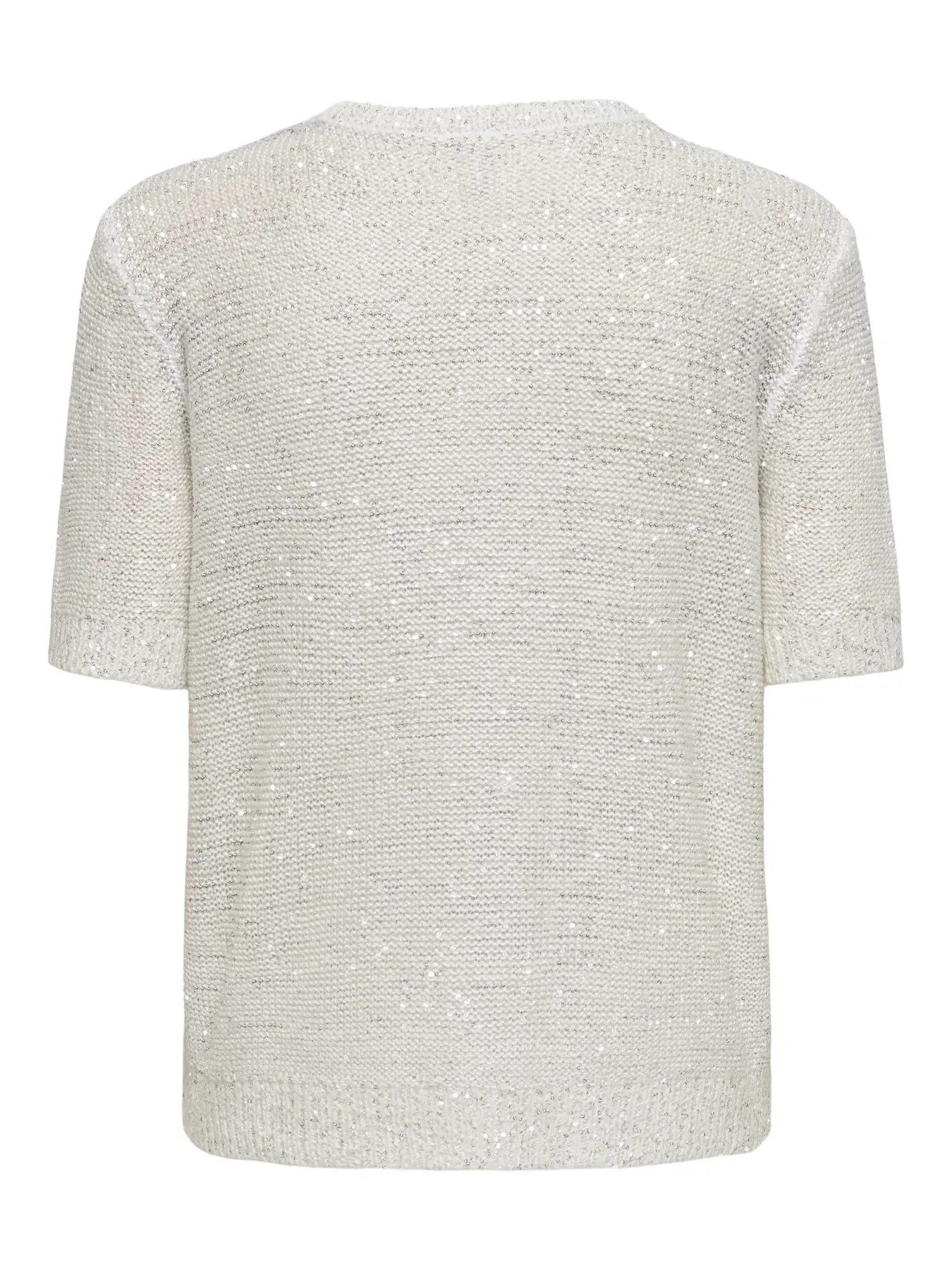 Stay warm and cosy with soft knitted styles, perfect for any occasion and season. Flat knit is a type of knitting characterised by its flexibility, comfort, and clean look. – Product Type : Knitted Short sleeve Pullover – Neck : Round Neck – Sleeve : Short sleeves – Cuffs : Ribbed cuffs – Extra details : Sequins – Fit : Knit Fit