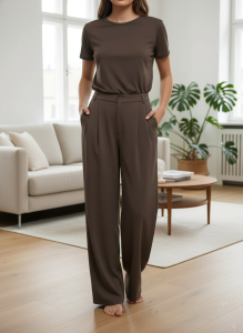 Elevate your everyday wardrobe with these tailored trousers. Designed in a classic wide-leg silhouette, they feature a clean front with subtle pleats that add structure and movement. The high rise waistband with belt loops and button closure creates a polished, flattering fit, while the smooth woven fabric ensures all-day comfort. Finished in a versatile brown tone, these wide leg trousers  transition effortlessly from workwear to casual styling. Perfect to pair with crisp shirts, knit tops, or blazers for a modern, confident look.