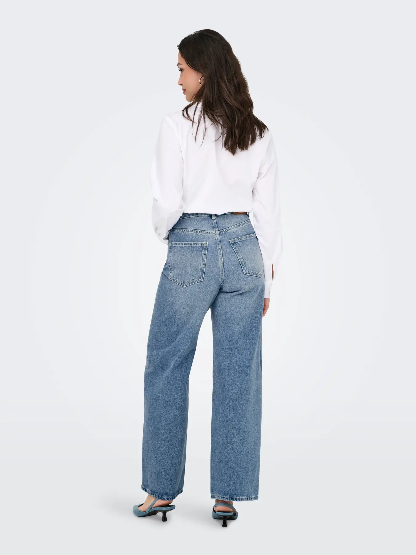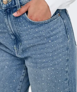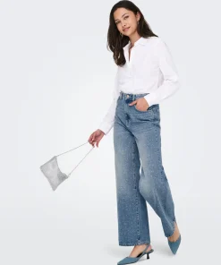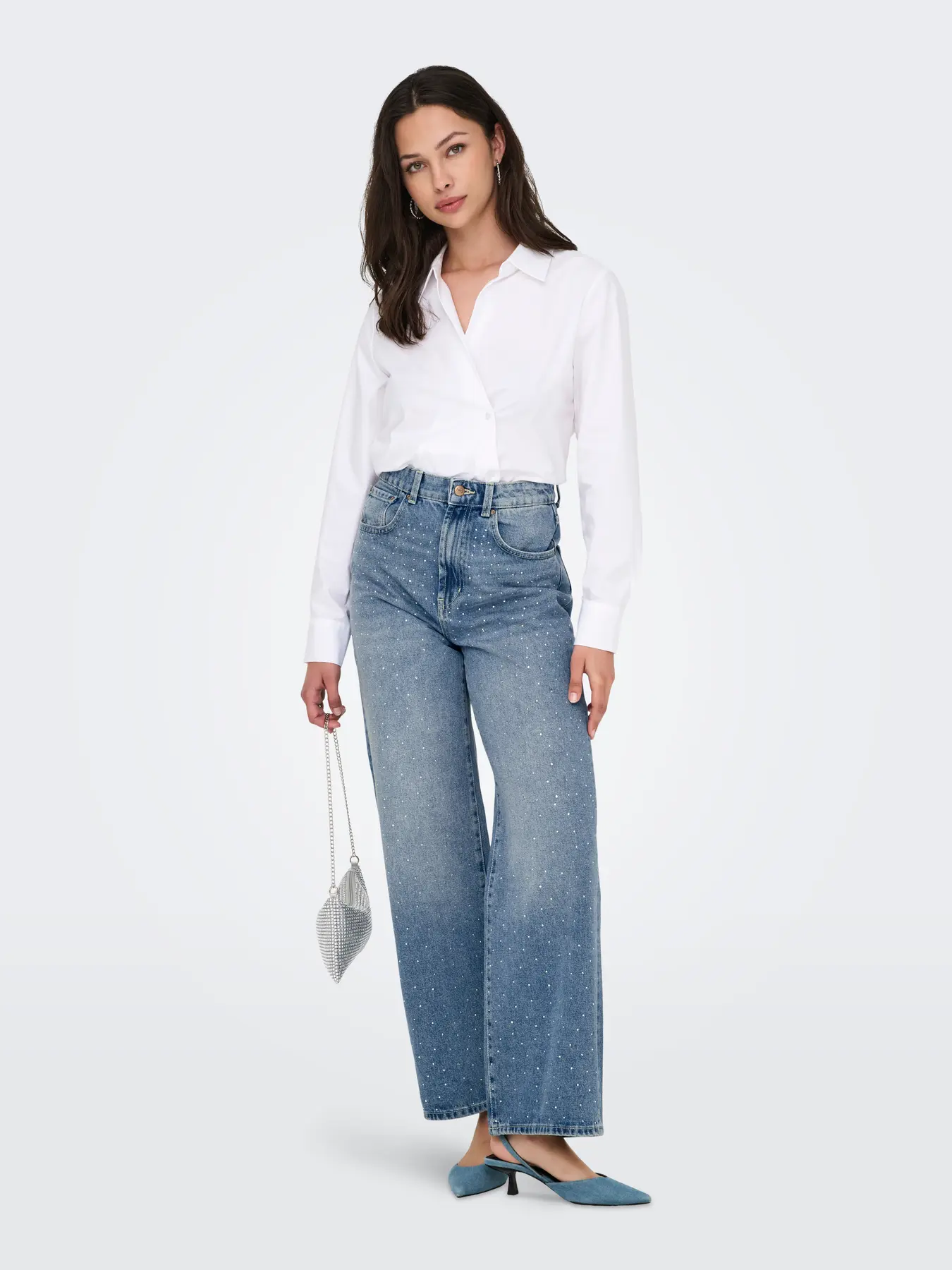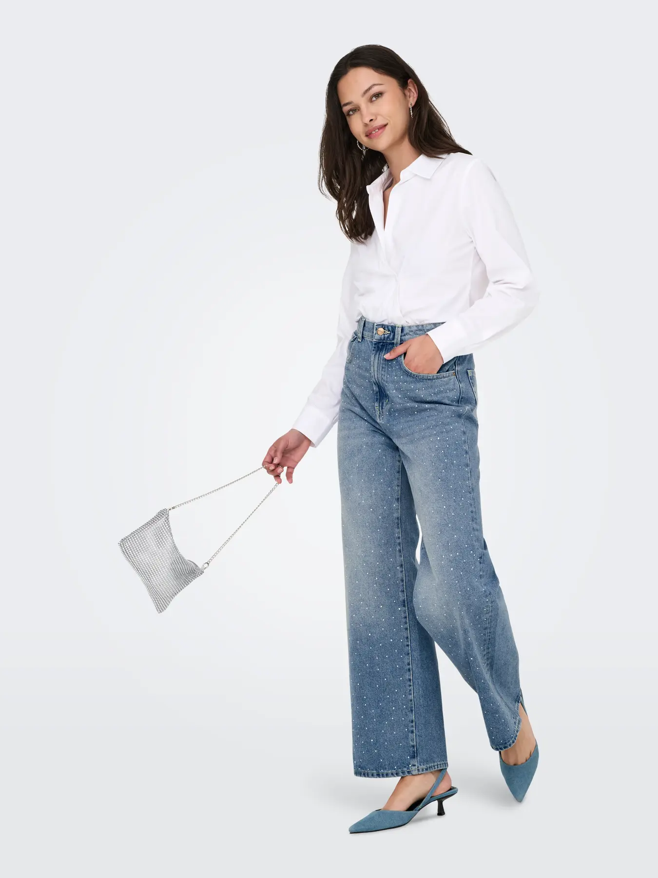 Find your new go-to item for both work and play with a pair of cool jeans in the perfect fit and colour. – Product Type : Wide-fit jeans – Closing : Zip fly fastening – Pockets : Back pockets, Front pockets – Waist : High waist – Extra details : Belt loops and rhinestone detail – Fit : This wide-leg style are designed with comfort in mind, with plenty of room from hip to ankle.
