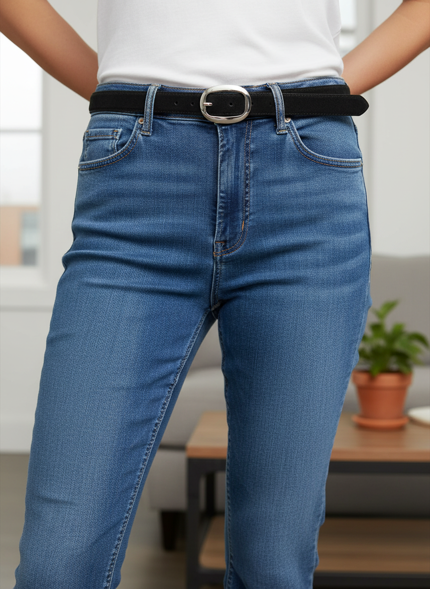 A suede jeans belt with a silver buckle is a versatile accessory that adds a touch of sophistication and texture to both casual denim looks and dressier outfits.