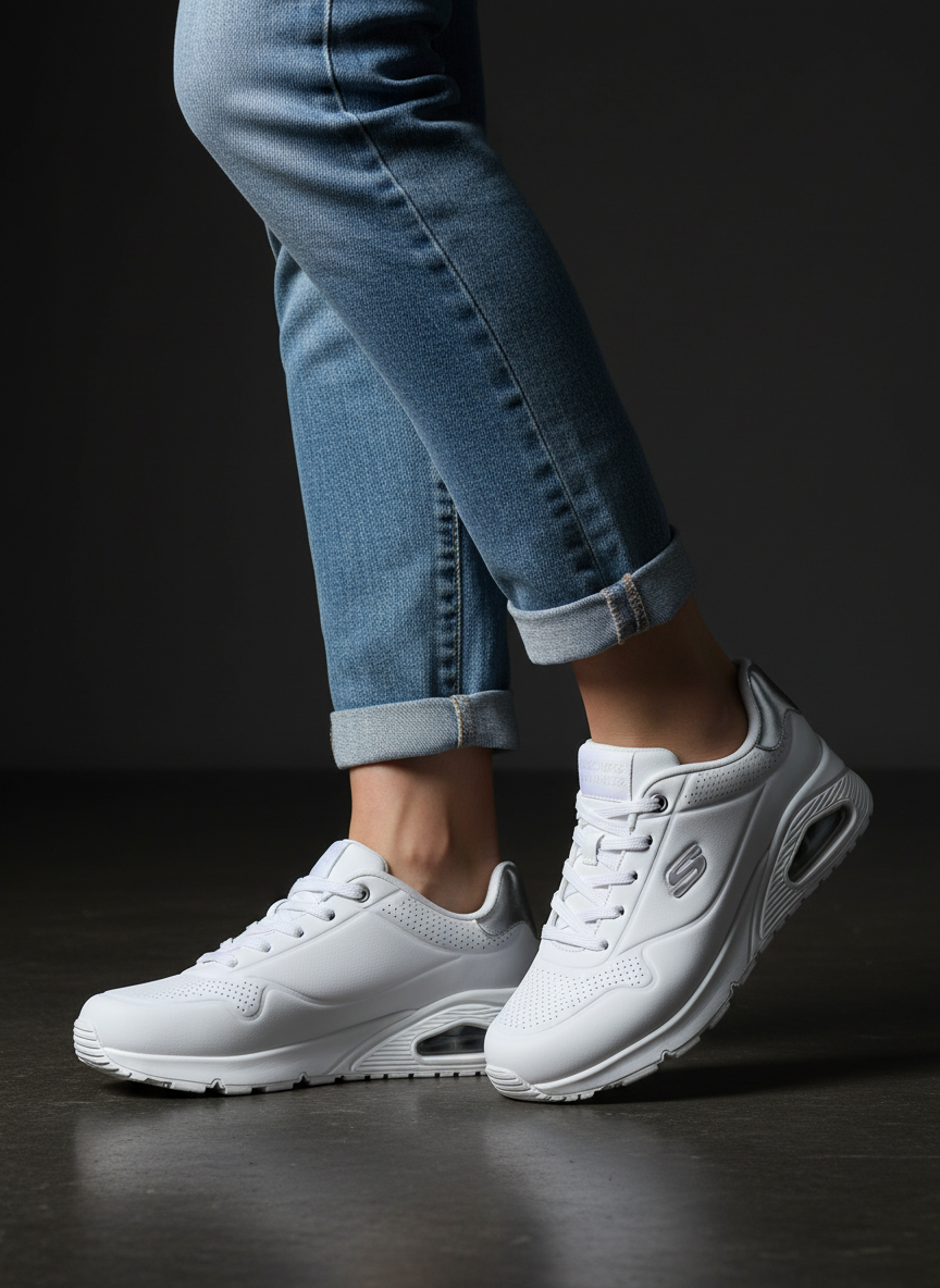 Enjoy a classic style this season wearing UNO – Shimmer Away. This wedge fit fashion sneaker features a synthetic durabuck upper with metallic heel trim, stretch laces, Air-Cooled Memory Foam® insole, and a Skech-Air® visible airbag midsole.