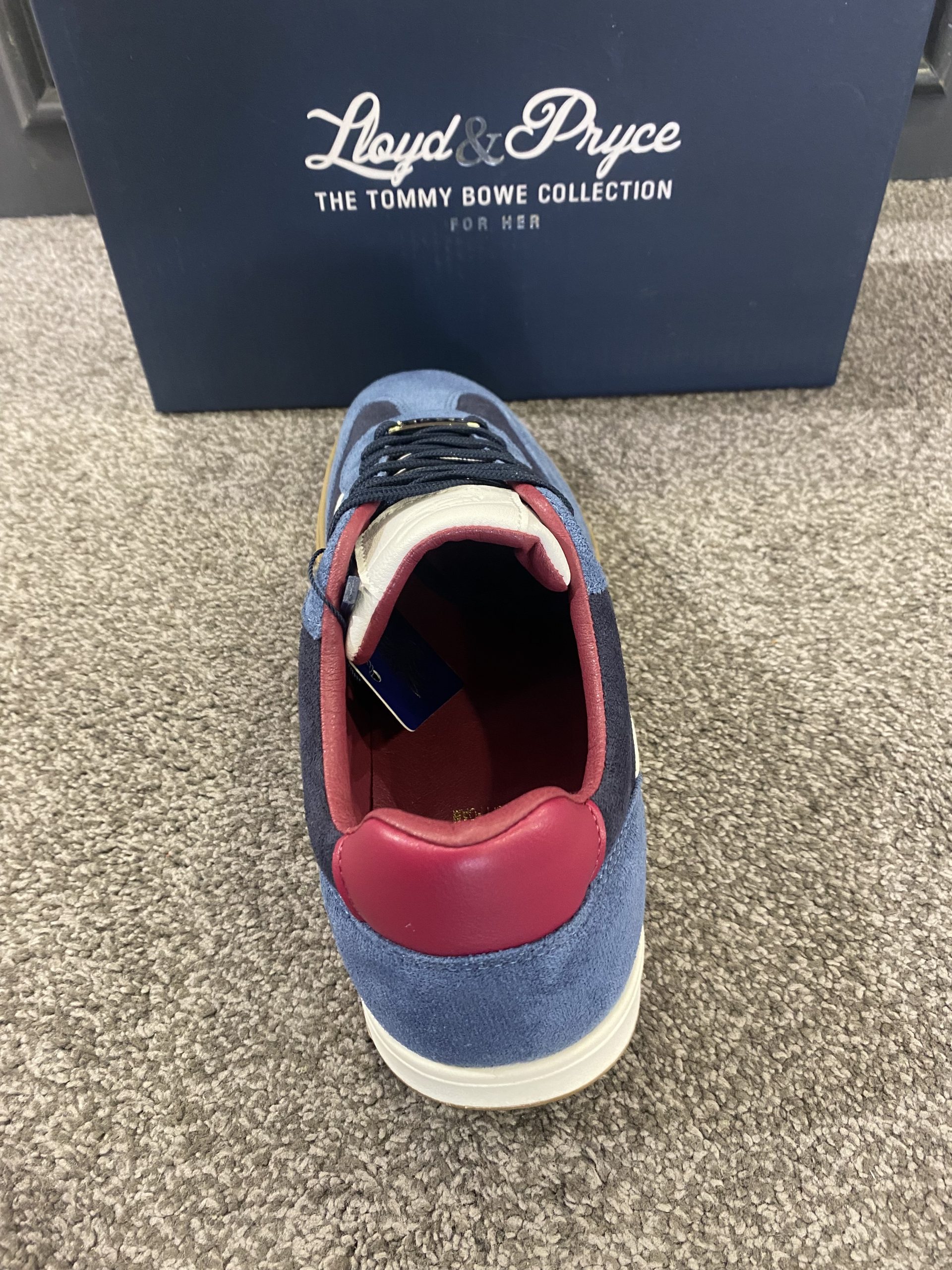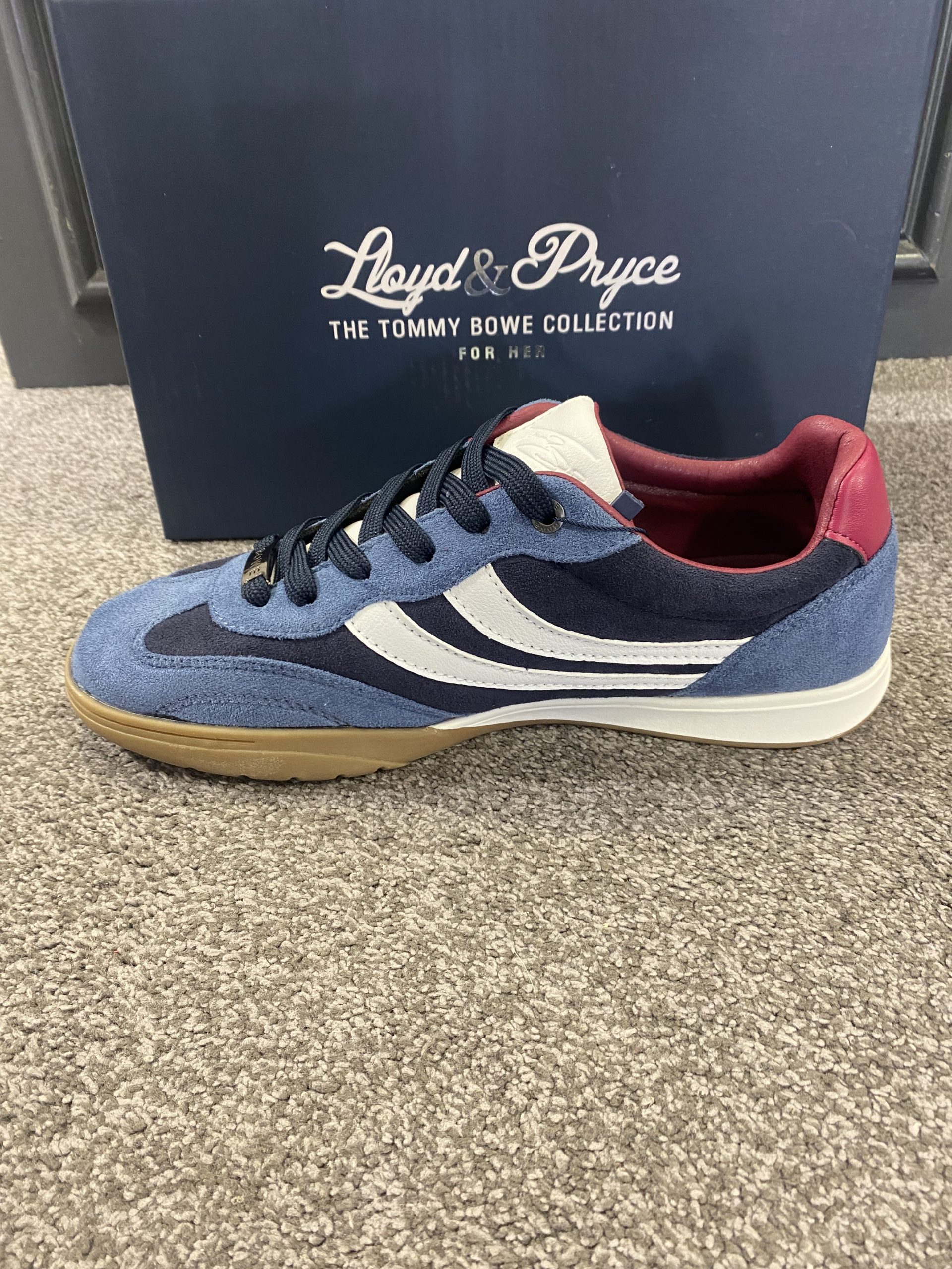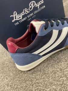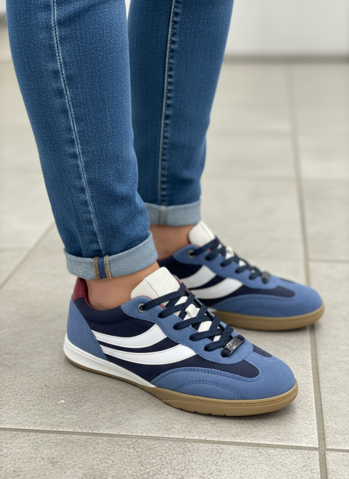 A mix of suede and textile in navy blue and denim blue tones . Burgundy accent on the heel collar .Classic gum rubber sole witha slightly raised tread for grip .There trainers are casual and versatle . leaning towards a classic vintage sportswear vibe – especially good for pairing with jeans or casual outfits .