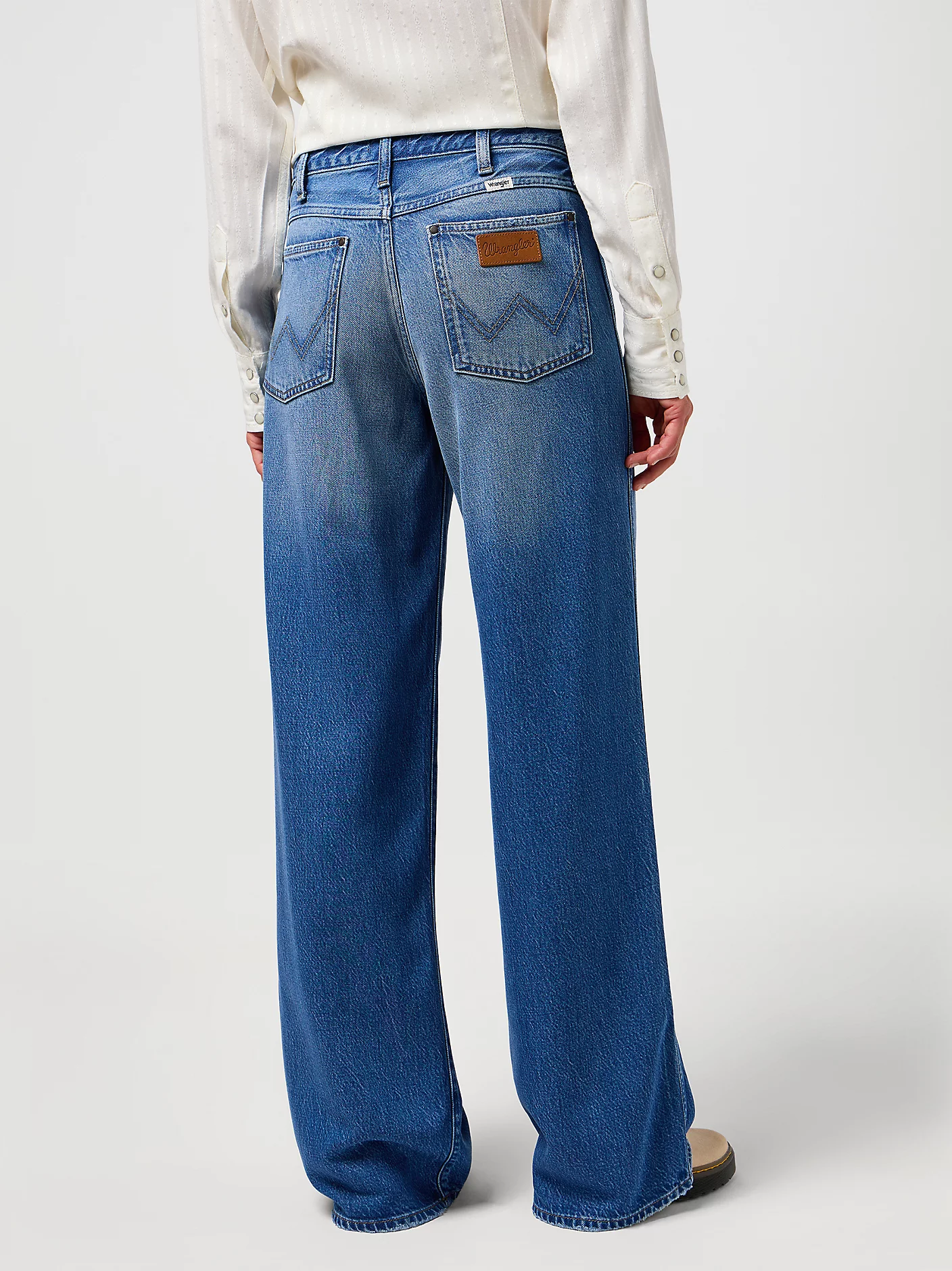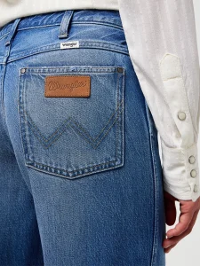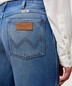Classic Wrangler details include a zip fly with button closure, belt loops, and the iconic brand patch on the back waistband.