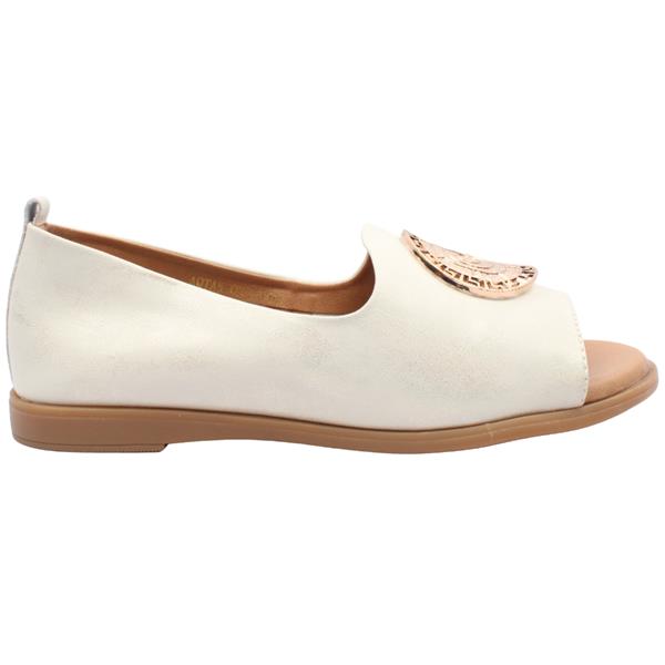 Design: A slip-on, open-toe (peep-toe) silhouette featuring a bold metallic circular disc detail across the front.